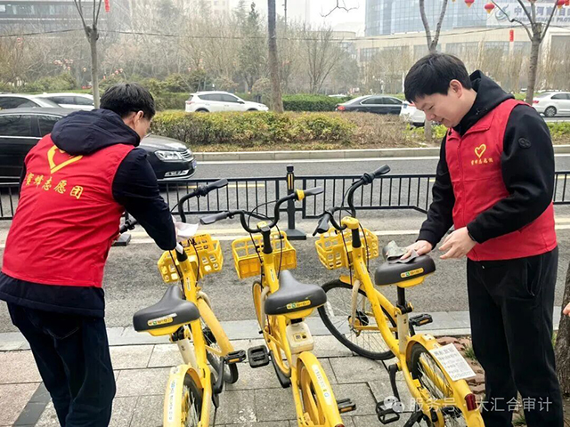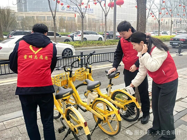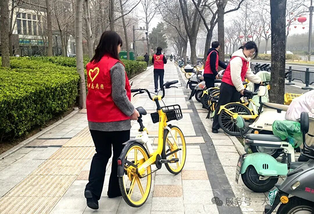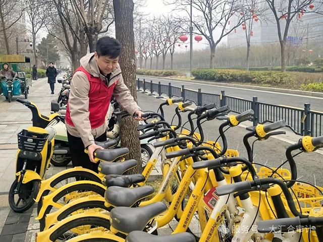 一群身穿“蜜蜂”马甲的志愿者,正在把路边的共享单车一辆一辆摆放整齐。有的在扶起倒在地上的单车,有的在调整车辆位置,还有的正在清理路车上的小广告、灰尘。大家分工配合,忙得不亦乐乎。这是大汇合开展的“清洁家园”美化城市环境志愿服务活动。党员、入党积极分子以及业务骨干积极参与,用实际行动践行雷锋精神。